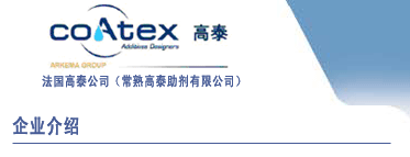 總部位于法國(guó)熱奈法國(guó)高泰公司是一家全球領(lǐng)先的水性外加劑生產(chǎn)廠家,隸屬于法國(guó)阿科瑪化工集團(tuán)。目前在全球14多個(gè)國(guó)家和地區(qū)擁有自己的生產(chǎn)產(chǎn)能,銷(xiāo)售團(tuán)隊(duì)和研發(fā)隊(duì)伍。全球范圍已獲得 ISO 9001-2000認(rèn)證。2009年法國(guó)高泰進(jìn)入中國(guó),并成立常熟高泰助劑有限公司。