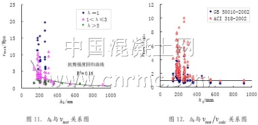 試驗(yàn)數(shù)據(jù)分析表明,無腹筋梁的抗剪強(qiáng)度受尺寸效應(yīng)的影響。即在混凝土強(qiáng)度、縱筋配筋率和剪跨比一定的情況下,隨著梁的有效截面高度增加,抗剪承載力呈下降趨勢,如圖11 所示。尺寸效應(yīng)的原因可以解釋為,隨著截面高度的增加,在斜裂縫的寬度增大,骨料之間的咬合作用削弱,導(dǎo)致承載能力下降。圖11 還表明尺寸效應(yīng)的大小與剪跨比密切相關(guān),對于λ>3的梁,有效高度對抗剪強(qiáng)度幾乎沒有影響。
