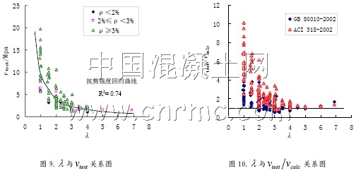 梁的剪跨比反映了梁的剪切破壞形態(tài),是梁抗剪強(qiáng)度的主要影響因素。圖9 給出了梁的剪跨比與抗剪強(qiáng)度試驗(yàn)值之間的關(guān)系,可以看出,剪跨比與抗剪強(qiáng)度的相關(guān)性較好。當(dāng)剪跨比由小增大時,在λ<2 區(qū)間,抗剪強(qiáng)度下降很快;2≤λ≤3區(qū)間,抗剪強(qiáng)度的變化已經(jīng)很小。λ>3以后,剪跨比對梁的抗剪強(qiáng)度影響不大。這主要是因?yàn)榱涸诳辜暨^程中同時存在“梁作用”和“拱作用”λ<3時“拱作用”較大,而λ>3以后“拱作用”逐漸減弱造成的。圖10 為剪跨比與抗剪強(qiáng)度試驗(yàn)值與計算值的比值test calc v v 的關(guān)系圖,圖中給出了試驗(yàn)值與中國規(guī)范計算值的比值點(diǎn)和試驗(yàn)值與美國規(guī)范計算值的比值點(diǎn)。可見在剪跨比λ < 2 時,兩國規(guī)范數(shù)據(jù)點(diǎn)均在vtest/vcalc=1以上,說明兩國規(guī)范公式在此區(qū)間都是安全的,但是美國規(guī)范比中國規(guī)范要保守;而當(dāng)λ≥2 時,中國規(guī)范有相當(dāng)一部分點(diǎn)落在了vtest/vcalc=1以下,說明中國規(guī)范公式對于大剪跨比的梁不安全;美國規(guī)范當(dāng)λ>3時也不安全。