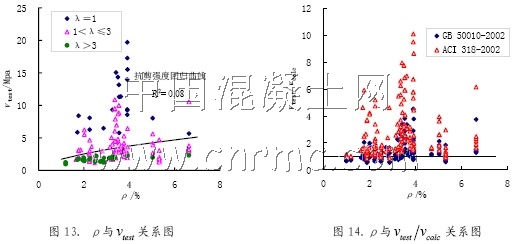 縱向鋼筋除了直接提供銷栓力以外,還使梁的中和軸降低,從而加大了斜裂縫頂部混凝土受壓區(qū)高度,間接提高梁的抗剪承載力。圖13 給出了縱筋與抗剪強(qiáng)度之間的關(guān)系,可見隨著縱筋配筋率的增加,梁的抗剪強(qiáng)度增大,但是數(shù)據(jù)離散性很大,縱筋配筋率與梁的抗剪強(qiáng)度的相關(guān)性較差。圖中還顯示對于小剪跨比的梁,縱筋配筋率對抗剪強(qiáng)度影響較大,但是當(dāng)剪跨比λ > 3時,增大縱筋率對梁的抗剪承載力幾乎沒有影響。圖14 則表明了梁抗剪強(qiáng)度試驗(yàn)值與計算值的比值隨縱筋配筋率之間的關(guān)系,圖中無論是用中國規(guī)范還是用ACI 規(guī)范計算,均有部分?jǐn)?shù)據(jù)點(diǎn)落在了vtest/vcalc=1以下,