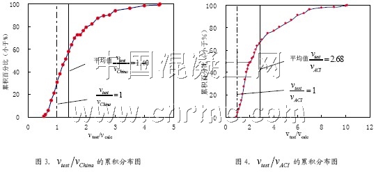 為了更直觀的體現(xiàn)試驗(yàn)抗剪強(qiáng)度小于計算抗剪強(qiáng)度的梁所占的比例,做試驗(yàn)值與計算結(jié)果比值的累積布圖于圖3和圖4。圖3顯示,試驗(yàn)值與中國規(guī)范計算結(jié)果比值vtest/vChina小于其平均值1.40 的數(shù)據(jù)占總數(shù)據(jù)的58%,vtest/vChina<1的數(shù)據(jù)占總數(shù)據(jù)的31%。圖4 表明,試驗(yàn)值與ACI 規(guī)范計算結(jié)果比值vtest/vACI小于其均值2.68 的數(shù)據(jù)占總數(shù)據(jù)的68%,vtest/vACI<1的數(shù)據(jù)占總數(shù)據(jù)的4%。