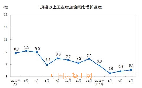 2015年5月份,規模以上工業增加值同比實際增長6.1%(以下增加值增速均為扣除價格因素的實際增長率),比4月份加快0.2個百分點。從環比看,5月份,規模以上工業增加值比上月增長0.52%。1-5月份,規模以上工業增加值同比增長6.2%。