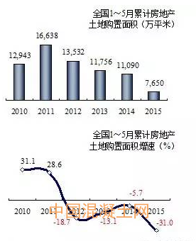 首先看房地產土地購置面積指標,2011年是高峰,隨后一路快速下降,2012年以來一直負增長,盡管2014年略有反彈,但仍是負增長,2015年1~5月的土地購置面積增速更是大幅度下跌。土地購置面積這一先行指標表明,在房地產存量沒有明顯改善情況下,這一趨勢是繼續下行。