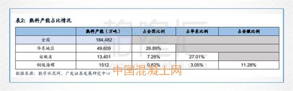 安徽是我國最大的熟料生產基地,2016年時熟料的產量位居全國的首位,在華東地區的熟料產能占比也高達27%。其中,安徽省的主要水泥產能地有銅陵,其熟料產能占全省比例的11%。