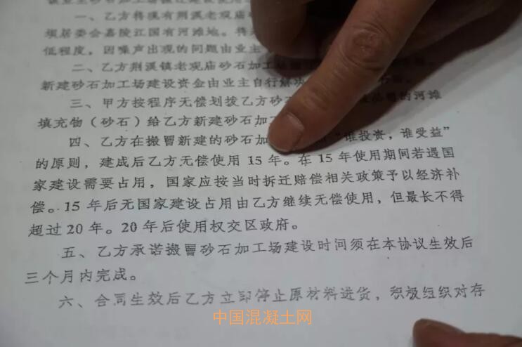 在順慶區政府指令下,同年5月10日,順慶區水利局、順慶區地方海事處配合搬遷、選址,與凌盛商貿、超越砂石場(超凡建材前身)、胡益平等達成了搬遷建設使用協議,約定將砂石加工場搬遷到位于搬罾鎮石狗壩居委會的嘉陵江國有河灘地,政府方面不予經濟補償,但無償劃撥建設必須的填充物(砂石);新建的砂石加工場建成后由投資者無償使用15年,“在15年使用期間若遇國家建設需要占用,國家應按當時拆遷賠償相關政策予以經濟補償。15年后無國家建設占用,由乙方繼續無償使用,但最長不得超過20年。20年后使用權交區政府。”