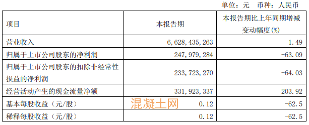 華新水泥(600801)4月27日晚間披露一季報(bào),一季度實(shí)現(xiàn)營業(yè)收入66.28億元,同比增長1.49%;凈利潤2.48億元,同比下降63.09%;基本每股收益0.12元。受市場需求影響,主要產(chǎn)品水泥量價(jià)下降。