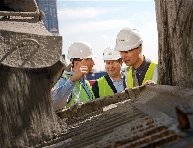 With a construction period of five years, dizzying heights and extreme climate conditions, the Burj Dubai presented a very special challenge to the concrete plasticizer: With the high-performance concrete plasticizer from BASF sold under the brand name Glenium SKY it was possible to pump the concrete up to an altitude of 600 meters without interruption. The foundations and the superstructure of the Burj Dubai required approximately 180,000 m3 concrete with Glenium plasticizer. “The construction of Burj Dubai is an engineering master piece. We are proud that we could contribute to the success of this project,” said Dr. Tilman Krauch, Head of Construction Chemicals division of BASF.