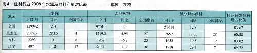 全省2008年水泥產量為2059.3萬噸,同比增長23.64%,高于全國平均水平,排名為第4位。51戶水泥熟料生產企業產量為1219.5萬噸,同比增長4.95%,低于全國平均水平,在全國排名為第22位。對比如表4: