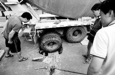 原來(lái),這輛車門(mén)寫(xiě)著“中誠(chéng)混凝土”字樣的水泥罐車為附近一家工地運(yùn)送混凝土,8日11時(shí)左右,水泥罐車在勞動(dòng)北路由南向北行駛,“借道”非機(jī)動(dòng)車道右轉(zhuǎn)彎時(shí)出了此事。隨后,為了防止?jié)M載混凝土的水泥罐車越陷越深,工地派出一輛卡車分5次,將十三、四噸混凝土卸下,為水泥罐車減輕自重。15時(shí)許,施救人員拿來(lái)鋼板、木塊等物品,鉆入坑中,試圖將這些物品墊在坑內(nèi)的輪子底下,然后用千斤頂將車輪頂出路面。截至近17時(shí)許,記者離開(kāi)現(xiàn)場(chǎng)時(shí),該水泥罐車依然陷在坑中,無(wú)法“自拔”。