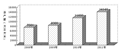據統計,2011年全省預拌混凝土總產量為1.414億立方米,與2010年同比增加2540萬立方米,同比增幅達21.9%,為近5年增長較快的一年。廣東省近幾年預拌混凝土產量增長情況如圖1: