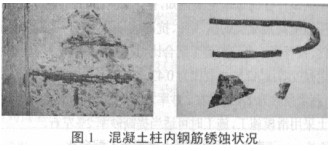 某大型公共建筑,地上4層,地下1層,框架結構,基礎為樁基,抗震設防烈度為7度:混凝土構件設計強度等級:-6.5~17m的柱為C40,梁、板為C30。興建于1995年,竣工于1998年,室內要求恒溫21℃。5年后,發現2層部分框架柱外貼石材出現縱向裂縫,敲擊有空鼓聲,觀察發現裂縫有發展趨勢。將柱裝飾石材和裝飾用混凝土層局部剔除后,發現柱混凝土沿鋼筋方向開裂,混凝土保護層疏松、酥裂,敲擊有空鼓聲,局部剝離混凝土保護層,發現柱內一些鋼筋銹蝕嚴重(見圖1)。