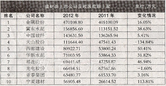 48家上市公司中,應收賬款排名前十家具體情況為:金隅股份47.01億元,同比增加16.05%;冀東水泥15.69億元,同比增加38.63%:中國玻纖14.36億元,同比增加5.41%;天山股份11.16億元,同比激增134.84%;西部建設8.09億元,同比增加50.41%;華新水泥7 .10億元,同比增加31.82%;祁連山6.94億元,同比增加46.94%;光電股份6.65億元,同比減少1.60%:亞泰集團6.35億元,同比增加3.16%;寧夏建材5.69億元,問比增加113.81%。